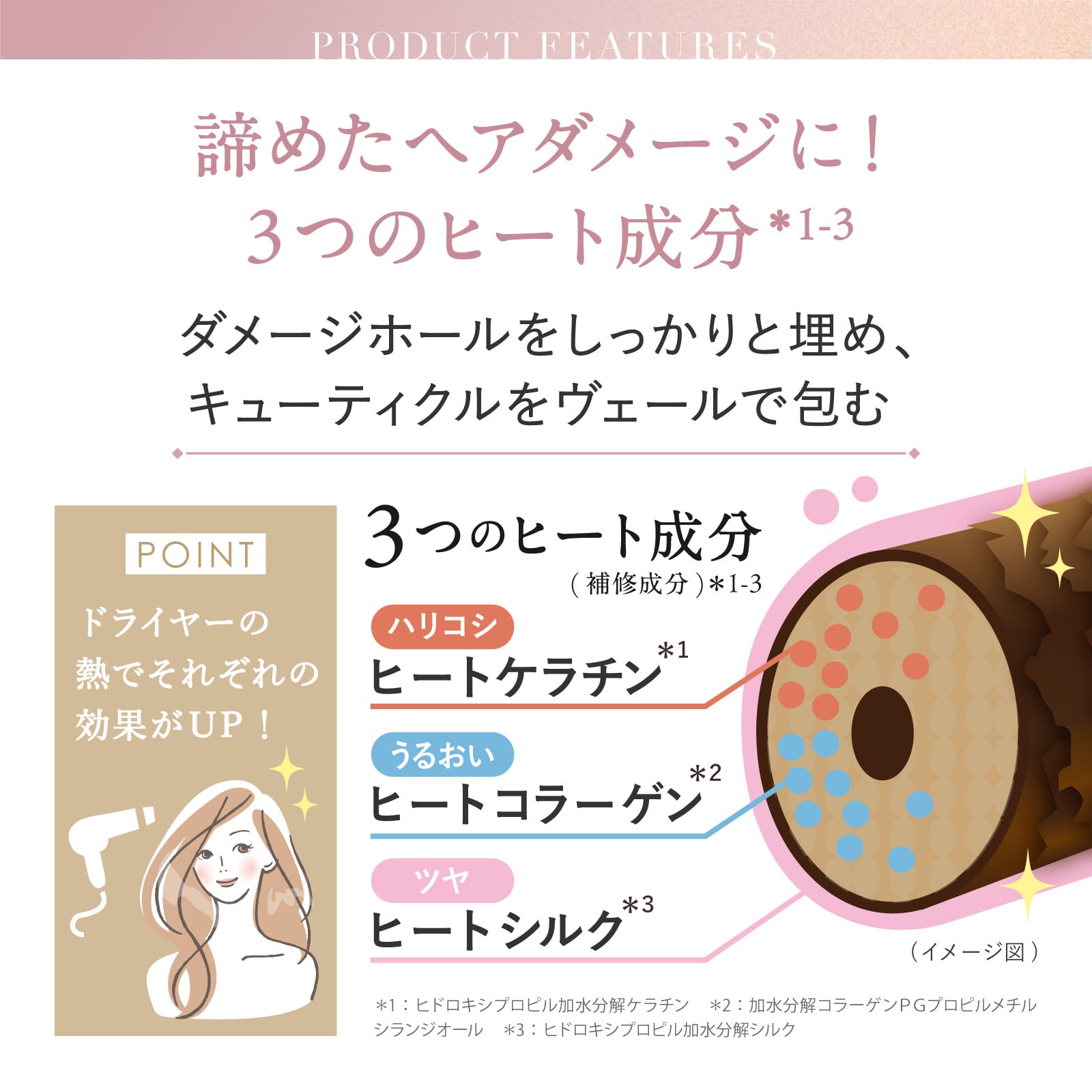 ドライヤーの熱で補修する「トリプルヒートリペア処方」で髪を高密着補修。さらに、今回のリニューアルで「レブリン酸(酸熱トリートメント成分)」「加水分解ケラチン(羊毛)(毛髪補修成分)」を配合しました。これまでよりもダメージやダメージによるうねりを抑え、「ハリ・ツヤ・潤い」のある髪へと導きます。ほかにも19種類のアミノ酸、酸熱トリートメント成分、毛髪補修成分を配合。髪に必要な水分を保持・調整し、ダメージを補修します。