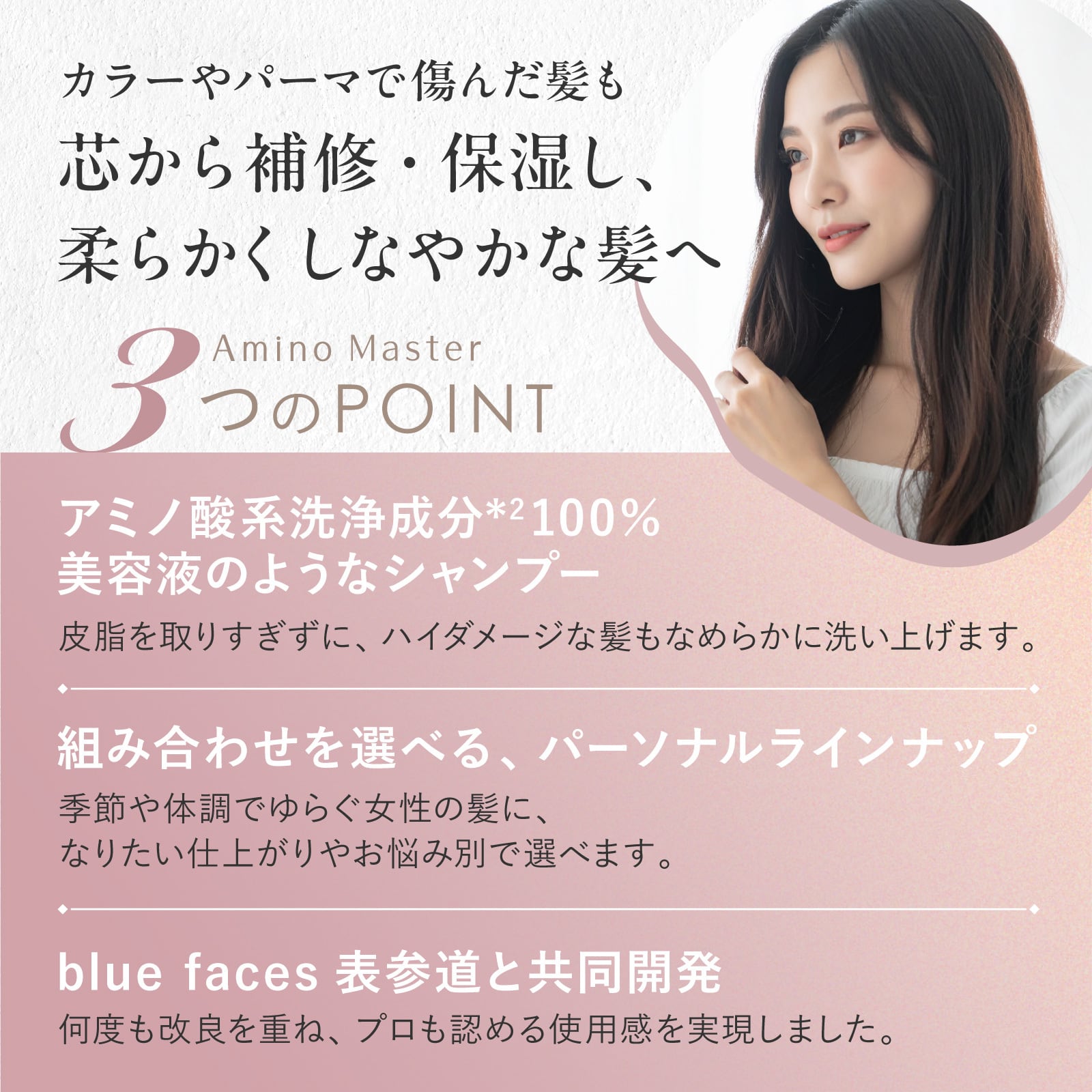 *髪を主に構成する【19種類のアミノ酸※2】配合で洗髪後もしっとりなめらかな指通りに