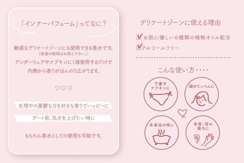 フォエリー インナーパフュームは韓国発のフェムケアブランド。開発者の妻が敏感肌のため、普段販売されている洗濯洗剤や柔軟剤を使わず、刺激の少ない石けんで下着を手洗いをしたあとに香水を数滴つけていたことがこのブランドのはじまりです。敏感なデリケートゾーンにも使用できるやさしい香水です。アンダーウェアやナプキンに1~2滴使用するだけで香りがほんのり広がります。